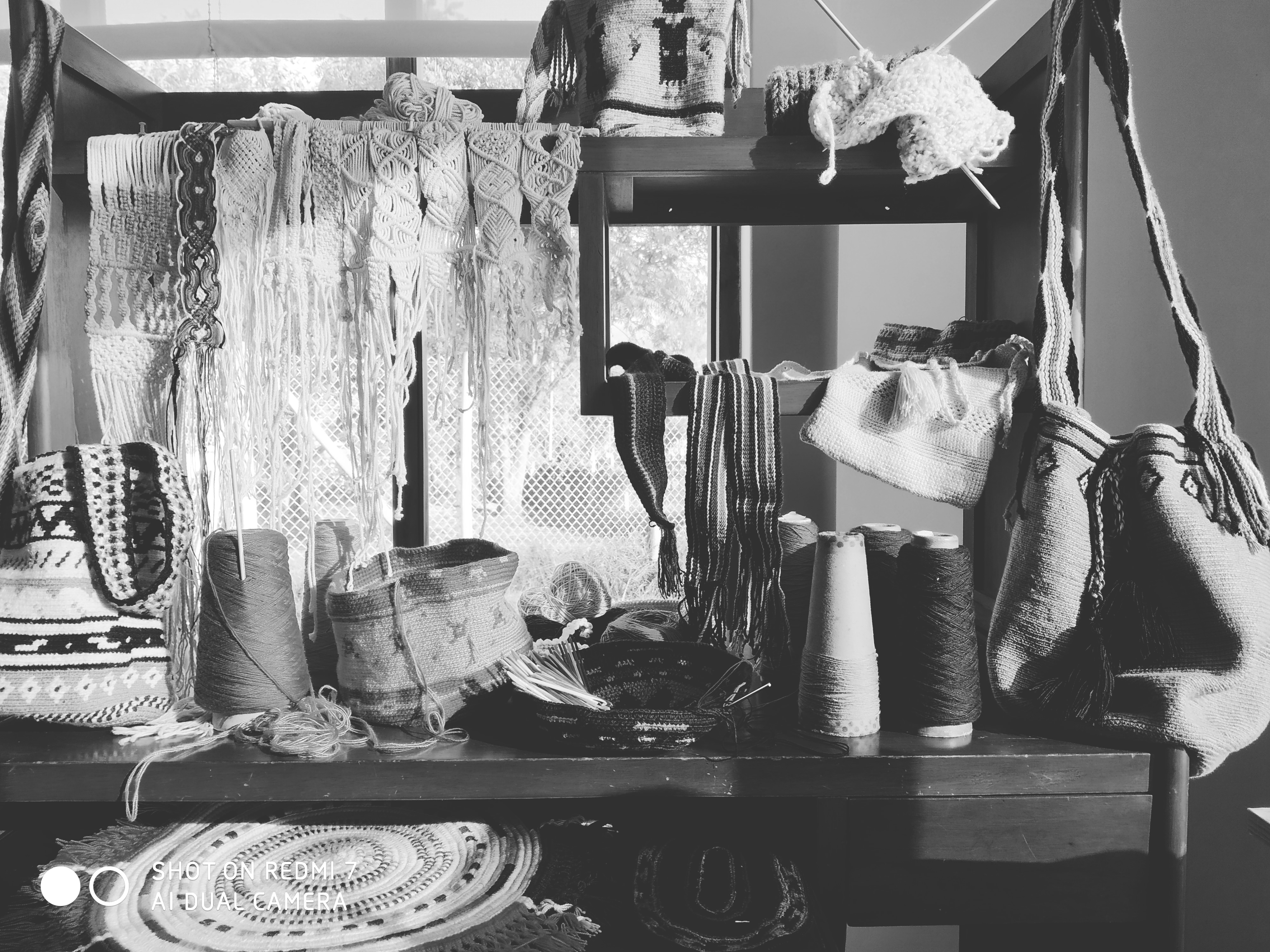 como tejidos wayú, macramé, crochet, lana en dos agujas y costura en máquina.